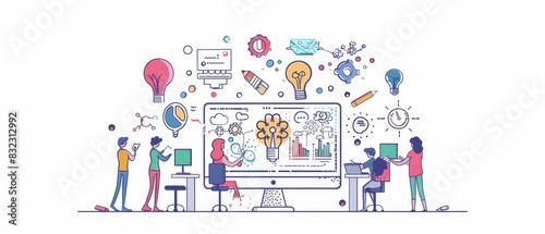 illustration of colorful creative agency business brain storm meeting people with icon line presentation young people team discussing roadmap
