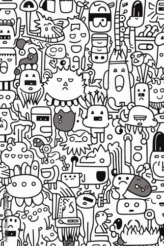 Illustration of coloring book doodle crowd cute alien monster Created with Generative AI technology.