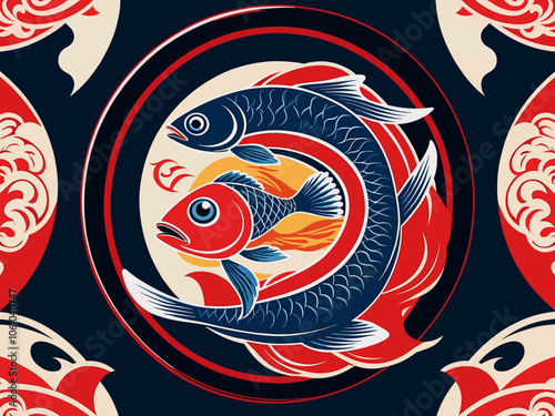 Illustration of cooking fish in traditional asian style. Ideal for oriental restaurant or souvenirs. Vector.