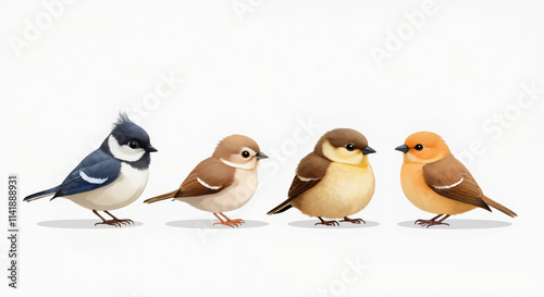 Illustration of Cute Birds in a Row with Distinctive Plumage for Nature Enthusiasts and Educational Use