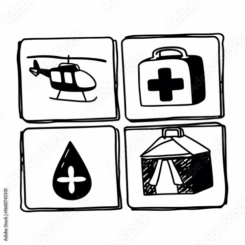 Illustration of disaster relief supplies including helicopter, first aid kit, and tent