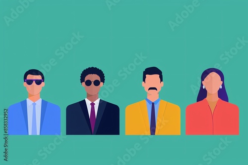 Illustration of diverse business professionals in colorful attire against a teal background, representing teamwork and diversity.