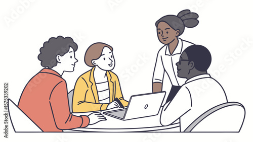Illustration of diverse team collaboration meeting with laptop for business strategy and brainstorming session