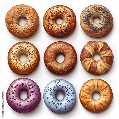 Illustration of donuts and bagels collection with colorful icing and toppings isolated on a white background. Suits for icons, backgrounds, presentations, social media posts & design projects.