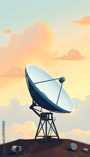 Illustration of features a satellite dish against a sky background for world telecommunication day, collage style, with white tones