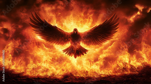 Illustration of Fire Bird, Wings Spread, Flame Background
