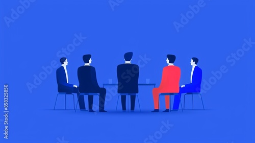Illustration of five businesspeople in colorful suits sitting at a table against a blue background, symbolizing teamwork and leadership.