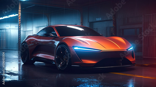 Illustration of future electric car in rainy dark city created with Generative AI technology.