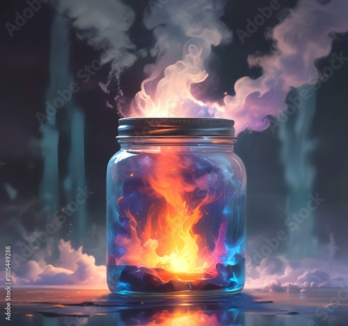 Illustration of glowing and magic dramatic smoke in jar with water reflection.