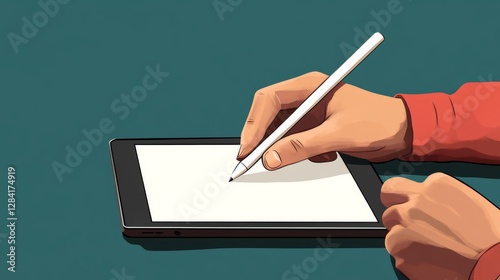 Illustration of Hand Using Stylus on Digital Tablet with Teal Background