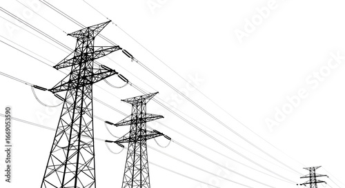 Illustration of high voltage power transmission towers with cables on white background, symbol of energy, electricity distribution, and modern infrastructure.