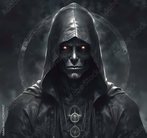 Illustration of hodded person in dark woods.