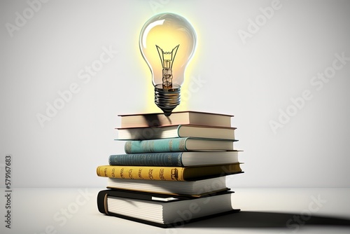 Illustration of light bulb and books, white background, ideas and creativity concept. Generative AI
