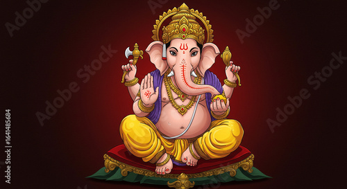 Illustration of lord ganesha seated on a cushion with a red and dark gradient background