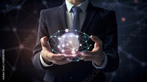 Illustration of male hans holding hologram sphere with plexus of nodes network, digital data concept. Futuristic sci-fi technologies. Abstract background. AI generative image.