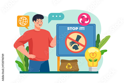Illustration of Man Promoting Stop Littering Message with Red Shirt Blue Sign Yellow Lightbulb and Globe Icon for Environmental Awareness Campaign