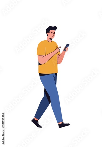 Illustration of Man Walking Using Mobile Phone Wearing Yellow T-Shirt