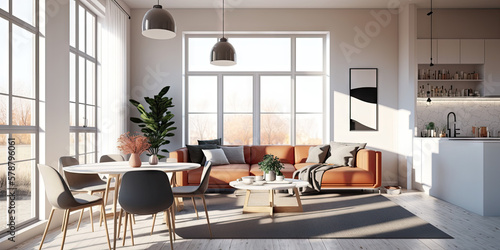 Illustration of modern light apartment with big windows created with Generative AI technology