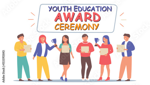 Illustration of people at a youth education award ceremony holding certificates and trophies smiling