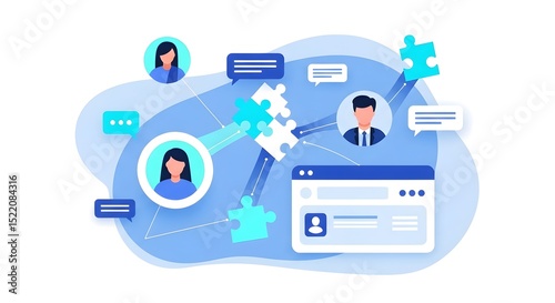 Illustration of people connected by puzzle pieces and communication bubbles online network