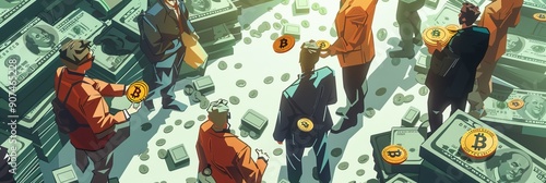 Illustration of people engaging in Bitcoin-to-dollar transactions, highlighting the versatility