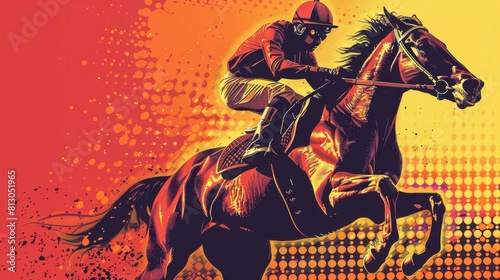 Illustration of racehorse at full speed on a racetrack, with a dynamic red and orange background.