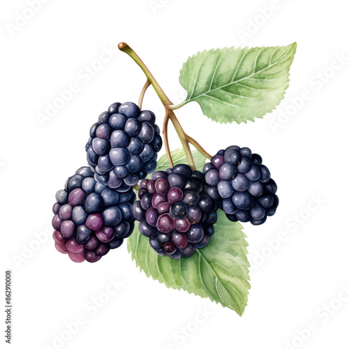 Illustration of ripe blackberries with green leaves on a transparent background.