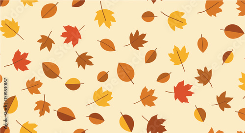 Illustration of scattered autumn leaves in various colors against a pale yellow background.