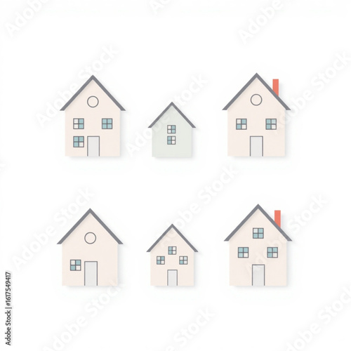 Illustration of six simple house icons with varying sizes and chimney details on a white background created with generated ai