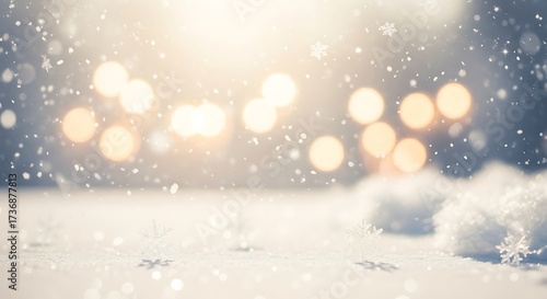 Illustration of soft focus winter snow scene with bokeh lights and snowflakes