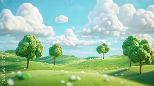 illustration of Summer fields landscape with a dawn,Rainbow, green grass hills, bright color blue sky, country background,banner resting vacation.