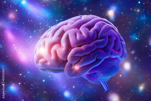 Illustration of the human brain with colorful details, on a blurry galaxy background
