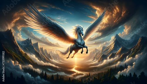 illustration of the mythological creature, Pegasus, soaring through the sky above a breathtaking landscape