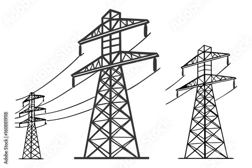 Illustration of three electricity pylons and power lines isolated on white background