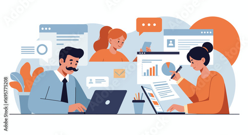 Illustration of three people working collaboratively on laptops, analyzing data, and communicating online in a modern workspace.