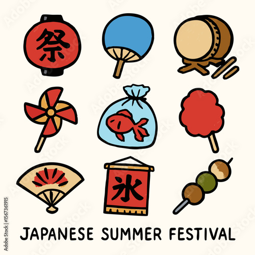 Illustration of Traditional Japanese Festival Items and Celebrations