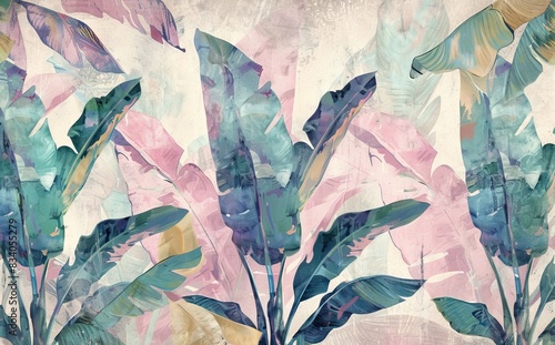 Illustration of tropical wallpaper print design with palm leaves, birds and texture. Exotic plants and birds on textured background. AI generated illustration