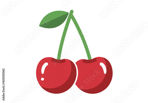 Illustration of two red cherries connected by green stems and a single leaf on a white background