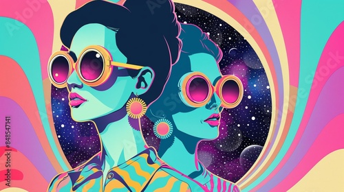 Illustration of two women wearing sunglasses in a psychedelic space scene.
