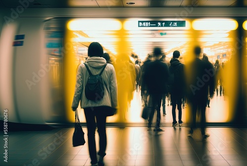 illustration of urban rush hour at underground train transit with blur defocused crowd of people