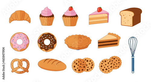 Illustration of various baked goods including cupcakes donuts bread pie cookies pretzel and a whisk tool on transparent background