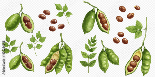 Illustration of various green seed pods, leaves, and loose seeds on a transparent background.