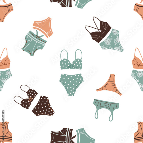 illustration of vintage bikini panties and bras forming seamless pattern for summer holiday concept