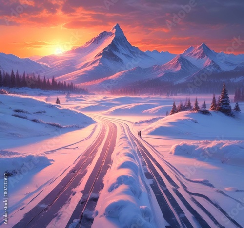 Illustration of winter landscape with road in wild.