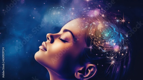 Illustration of woman sleeping and dreaming. Psychic girl considers mind and heart, spirituality, esotericism. Psychic waves concept, Generative AI illustration