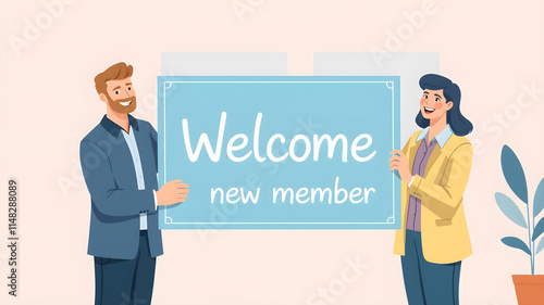 illustration people holding a welcome board to greet a new employee. new member concept, welcome words. flat design. can be used for elements, landing pages, UI. Generative AI