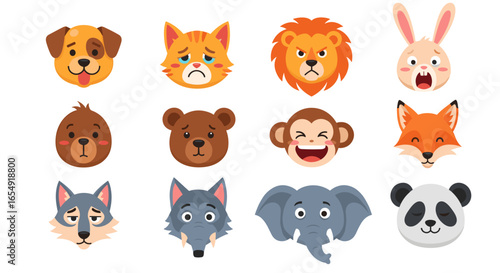 Illustration showing a variety of cartoon animal faces with different expressions and characteristics