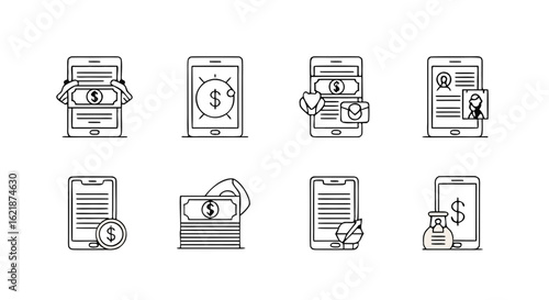 Illustration showing mobile devices with money transfer and other financial concepts displayed on the screens
