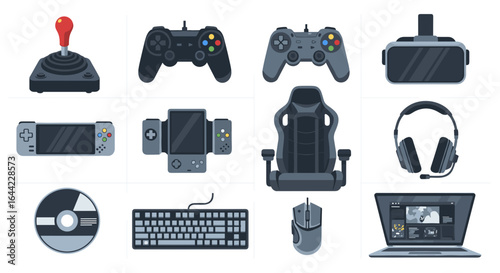 Illustration showing various gaming equipment including controllers headset and a gaming chair on a white background