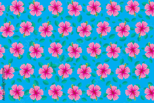 Illustration wallpaper of hibisscus flower with leaves on blue background.